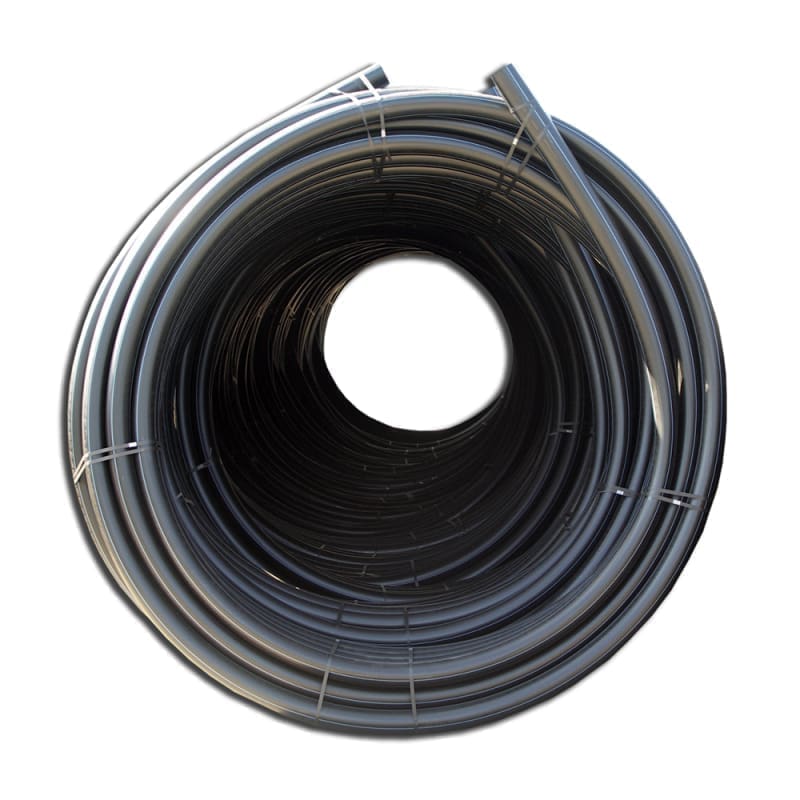 Black pipe, extruded from PE100 high-density polyethylene compound. The PE100 compound is a homogeneous